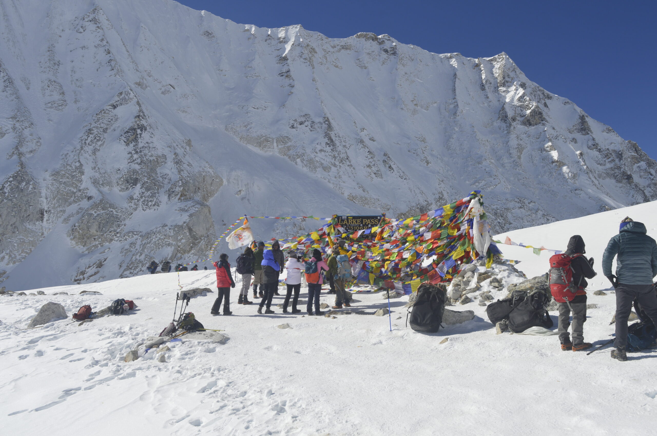 We’ll start our day early to cross the Larkya Pass. The climb to the pass takes about five hours, starting with a gentle ascent that soon turns steeper as we navigate scree and snow. Once we reach the top, we’ll be rewarded with breathtaking panoramic views of peaks soaring over six, seven, and even eight thousand meters.